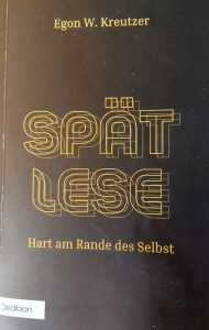 Rezension. Das neue Buch von Egon W. Kreutzer ‚Spätlese‘ hält, was der Untertitel ‚Hart am Rande des Selbst‘ verspricht. So führt der Autor in seinem Alterswerk als Ich-Erzähler das Gespräch mit dem eigenen Selbst, dem ‚Er‘. Das ‚Ich‘ und das ‚Er‘ wiederum ergeben das ‚Wir‘ – eine fast kafkaeske Reflektion über Bewusstes und Unbewusstes.